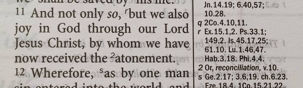 If you turn to Romans 5:11 in the Westminster Reference Bible, the Newberry Bible, the Scofield Reference Bible and other KJV Bibles with study notes you will see that the note relating to Romans 5:11 points out that the correct meaning and rendering of the Greek is “reconciliation” rather than “atonement”. Charles C. Ryrie picks up on this in his Study Bible. The note in the Ryrie KJV Study Bible for Romans 5:11 says, “ the atonement. Lit., the reconciliation, meaning “change.” God changes us from enemies to family. The word translated atonement is exclusively an OT word, though theologically it has come to stand for total significance of Christ’s death. On reconciliation see note on 2 Cor. 5:18.” Ryrie’s note on 2 Cor. 5:18 reads, “ reconciliation involves a changed relationship because our trespasses are not counted against us (v. 19). We are now to announce to others this message of God’s grace.”